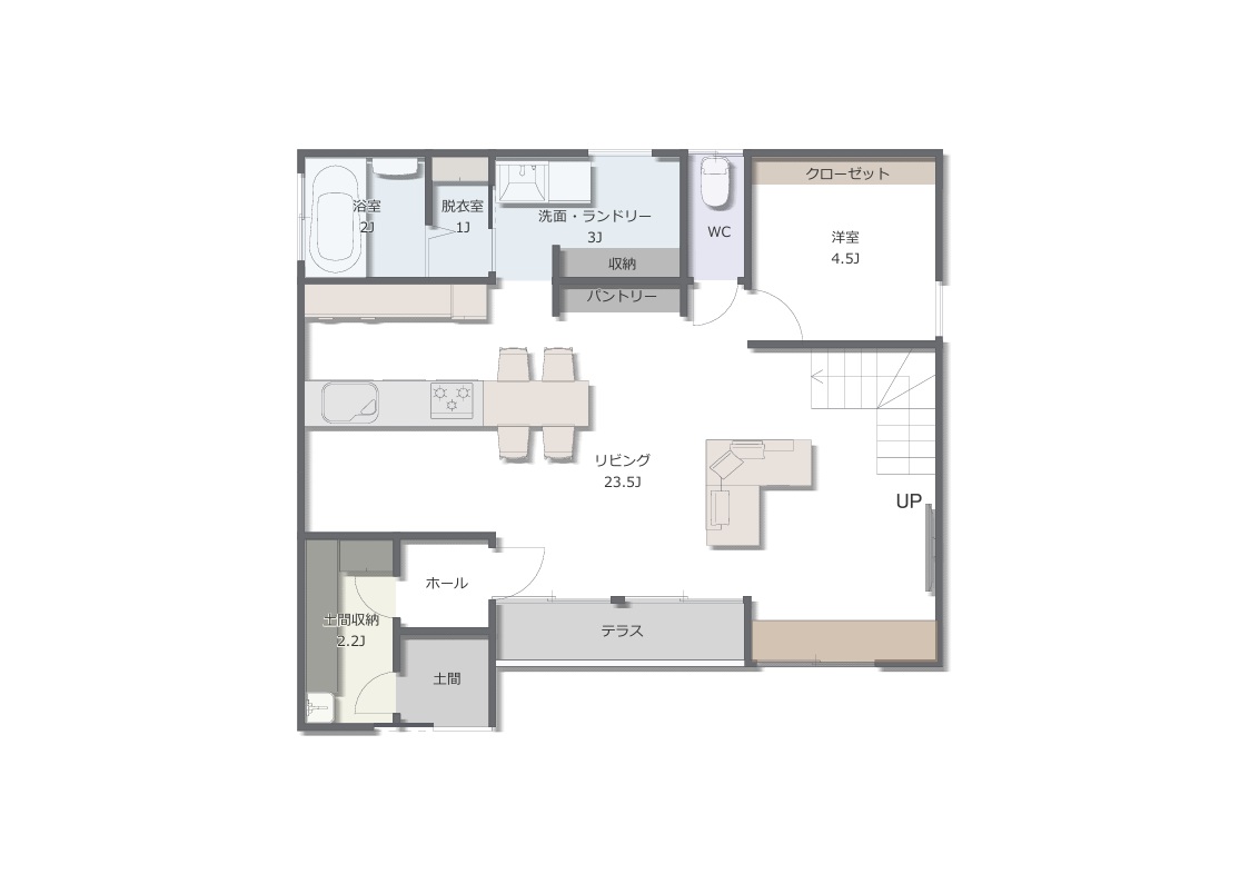 キッチン横にはパントリー、さらにその奥にランドリーや脱衣室を配置。洗濯→干す→しまうの流れがスムーズに行えるよう設計されています。水まわりと家事動線が集約されているので、毎日の家事を効率化でき、暮らしにゆとりが生まれます。
