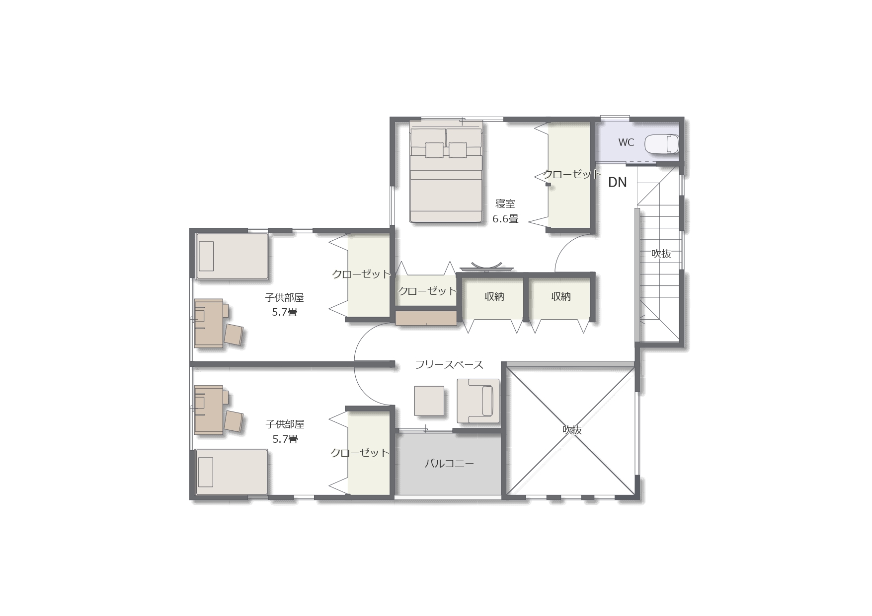 2階には主寝室(6.5帖)と子ども部屋(各5.7帖)を配置。全居室にクローゼットが備わり、さらに2カ所の収納スペースも確保。片付けやすく、生活が整いやすい間取りです。