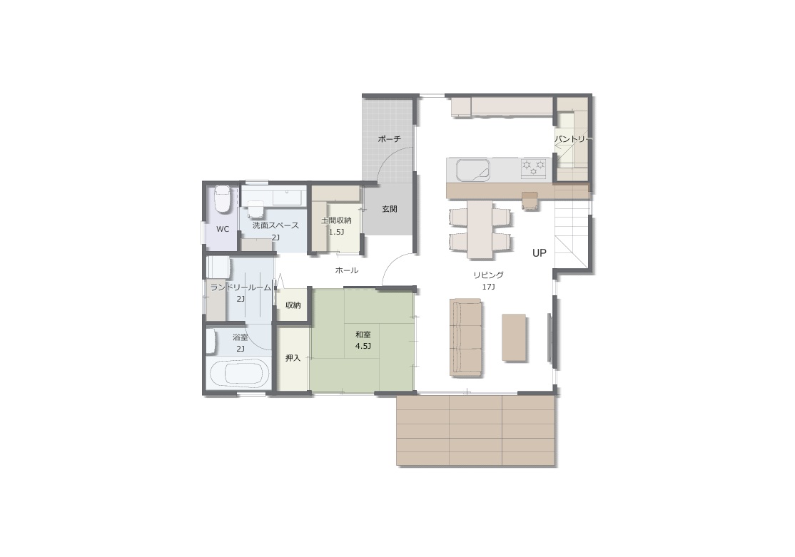 1階の中心には17帖のリビングを配置。和室4.5帖とも隣接しており、扉を開放すれば一体空間として使うことができます。家族の暮らしに合わせて柔軟に使えるのが魅力です。