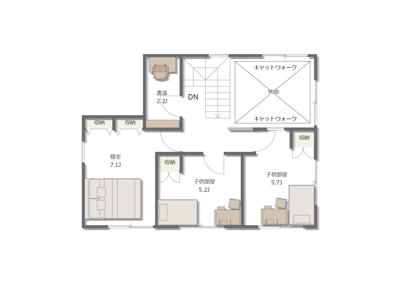 - 吹抜け+キャットウォークで開放感と遊び心を両立