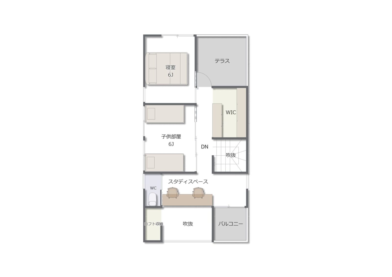 主寝室・子ども部屋ともに6帖を確保し、家具配置がしやすい形状です。大きめのWICもあり、季節物の衣類や布団類もすっきり収納できます。子ども部屋は将来の生活スタイルの変化にも柔軟に対応できます。