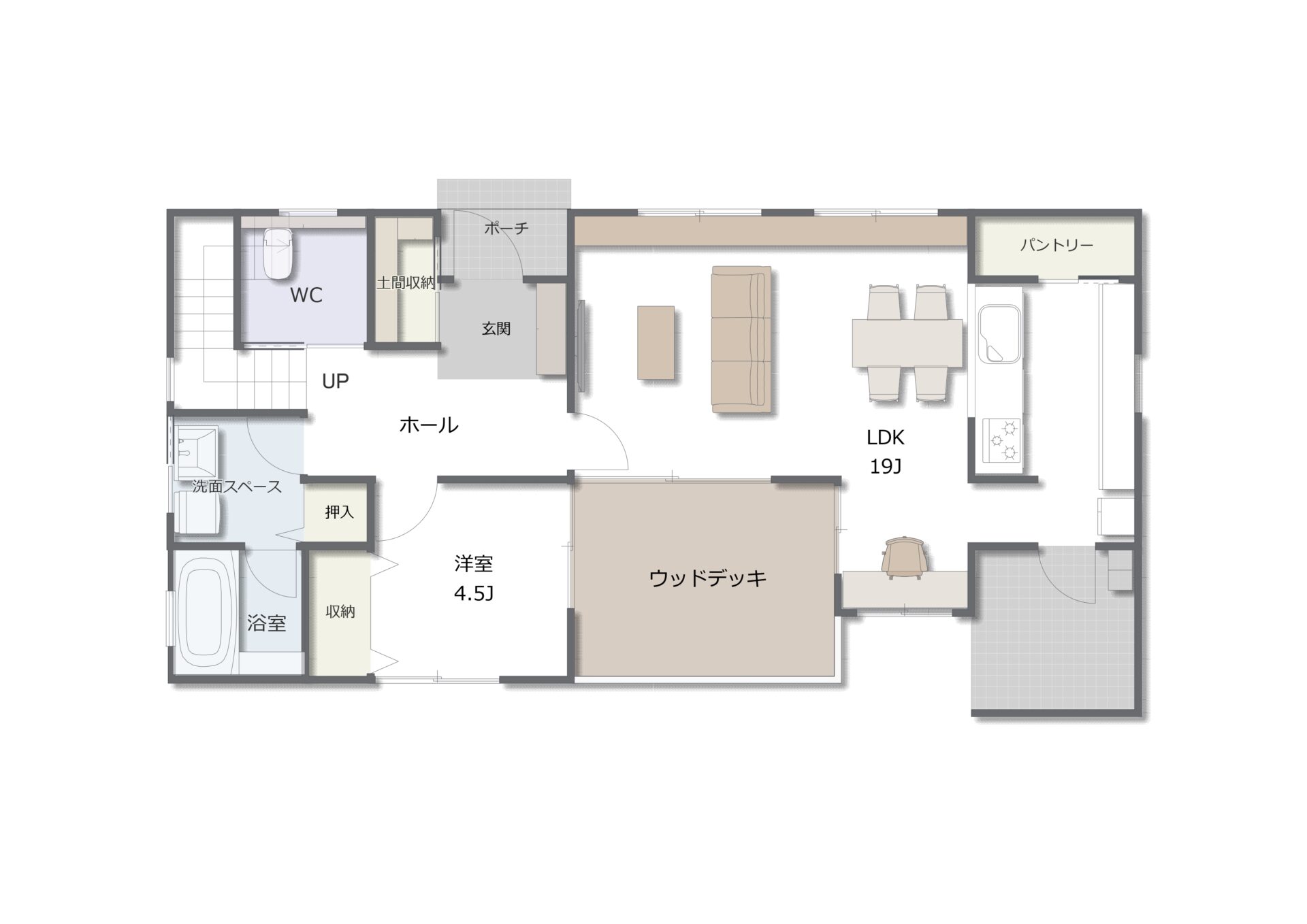 19帖のLDKは南側のウッドデッキとつながり、実際の帖数以上の広がりを感じられる空間です。食事・くつろぎ・屋外時間がスムーズに行き来でき、生活の幅が自然と広がります。