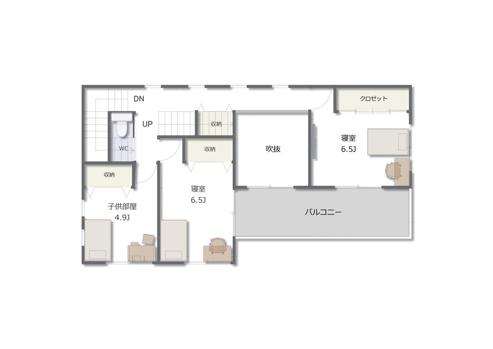 2階は6.5帖×2部屋の寝室をあえて分けて計画しており、リモートワーク時のオンライン会議や生活リズムの違いに柔軟に対応できます。大きなバルコニーと吹抜が、各部屋に明るさと開放感をもたらします。