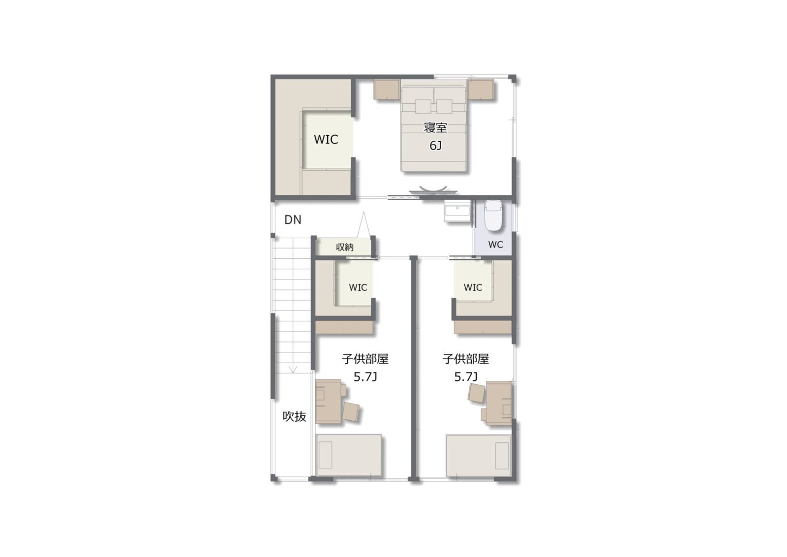 主寝室(6帖)には大容量のWIC、子供部屋(各5.7帖)にもそれぞれWICを配置。