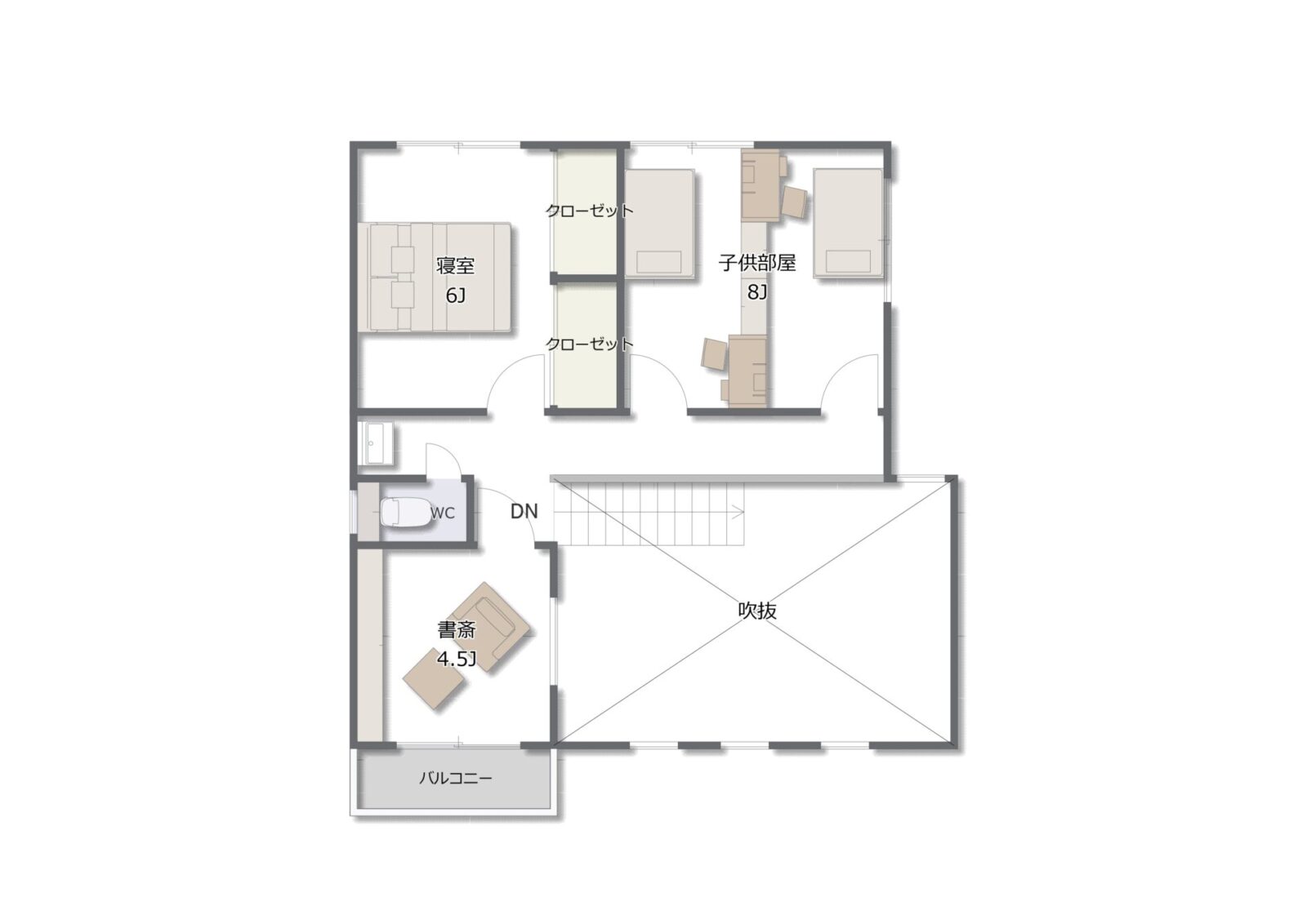 2階は吹き抜けに面したホールを中心に、寝室6帖と子ども部屋8帖を配置。