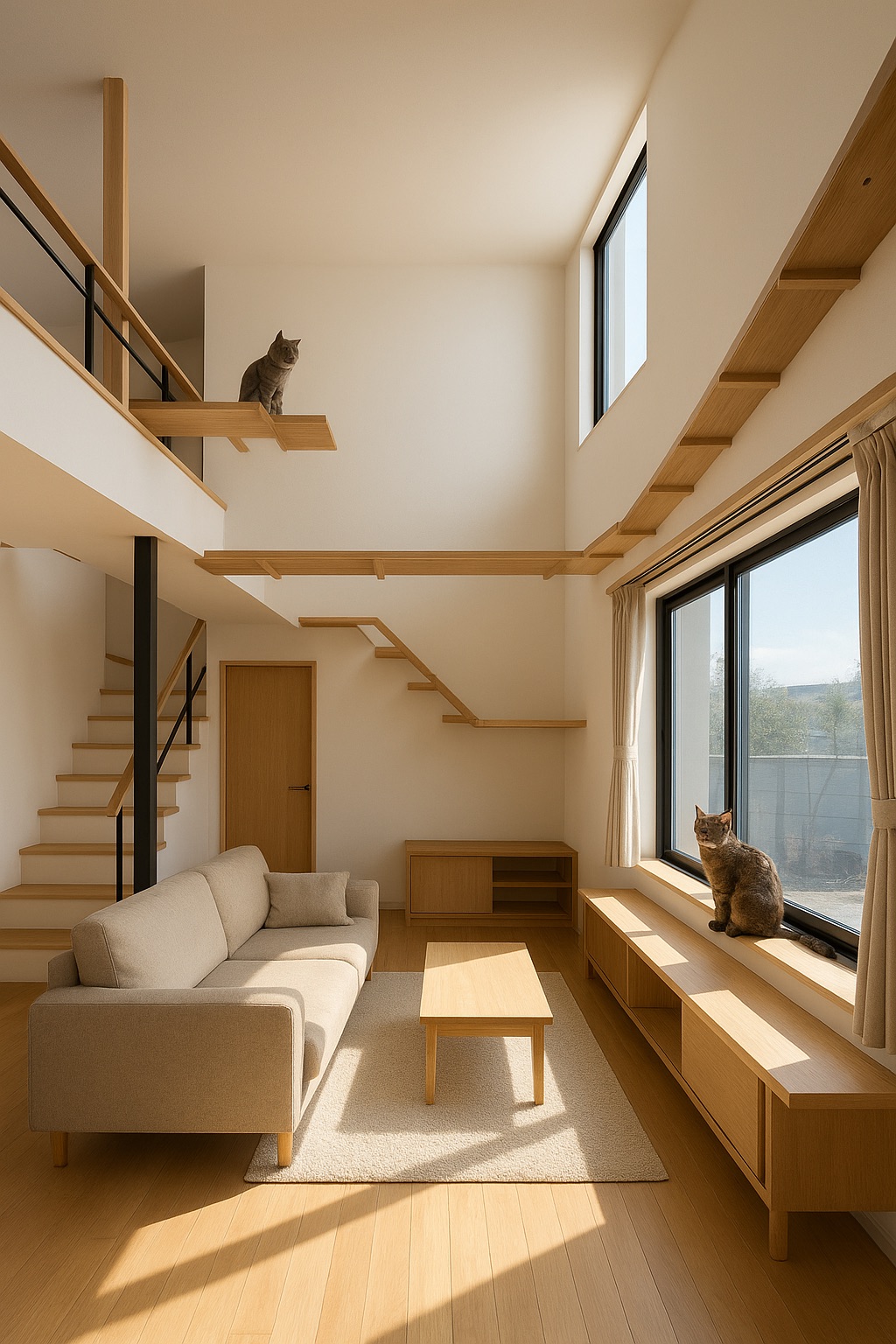 リビングにはキャットウォークを設けて、猫が自由に動けるようにしました。